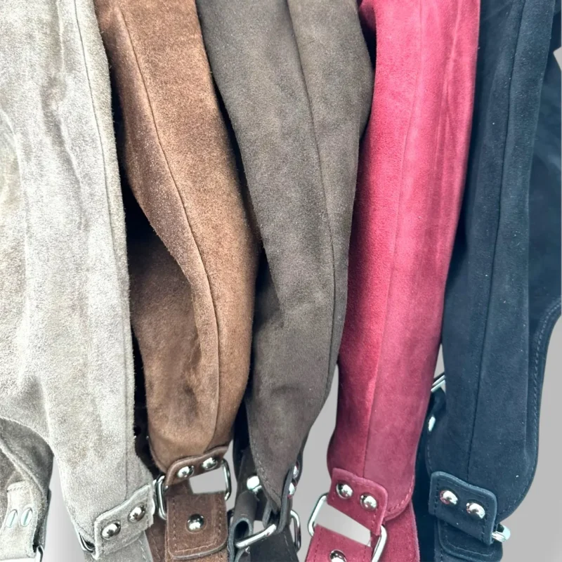 Borsa Ambra: morbida, capiente e di stile senza tempo. Realizzata in suede effetto velluto con manico ampio e chiusura a zip sicura. Dettagli in hardware dorato per un tocco di eleganza. Perfetta per uno stile raffinato e quotidiano.