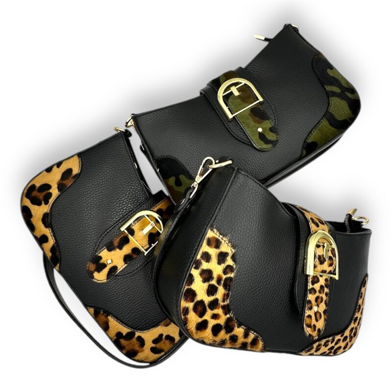 Our Leopard Print Pony Skin Shoulder Bag (Large Leopard, Zebra, Military) with Gold Metallic Details is a bag with a strong visual impact, adding a touch of personality and glamor to your look, adapting to both sophisticated looks and casual outfits. Its capacity is ideal for everyday use, allowing you to comfortably carry essentials.