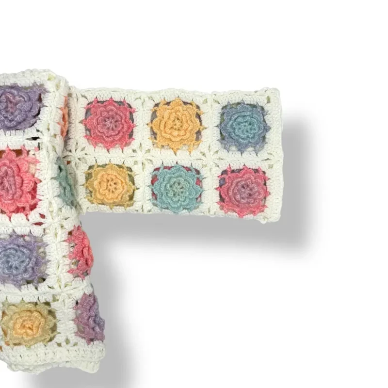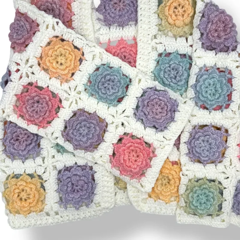Handmade cardigan with a white base and three-dimensional flowers in pastel shades. A unique, comfortable, and romantic piece, perfect for casual or boho looks on cool days.