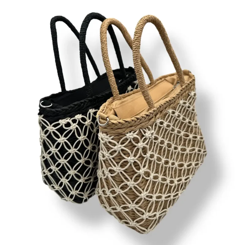 Design intrecciato con rete in macramè, leggera, spaziosa e perfetta per l’estate.