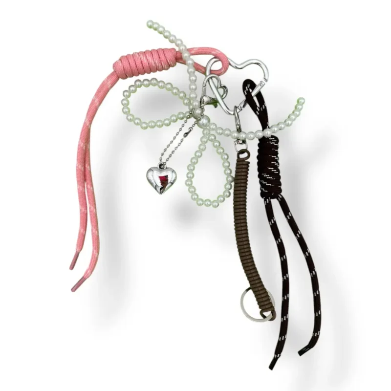Un charm elegante e delicato, con un fiocco rosa cipria e marrone cioccolato, arricchito da perle bianche che creano un movimento raffinato. Appeso a un moschettone a cuore, Pink Brown Ribbon aggiunge un tocco chic e personale alla tua borsa o zaino, perfetto per chi ama distinguersi con stile e dolcezza.