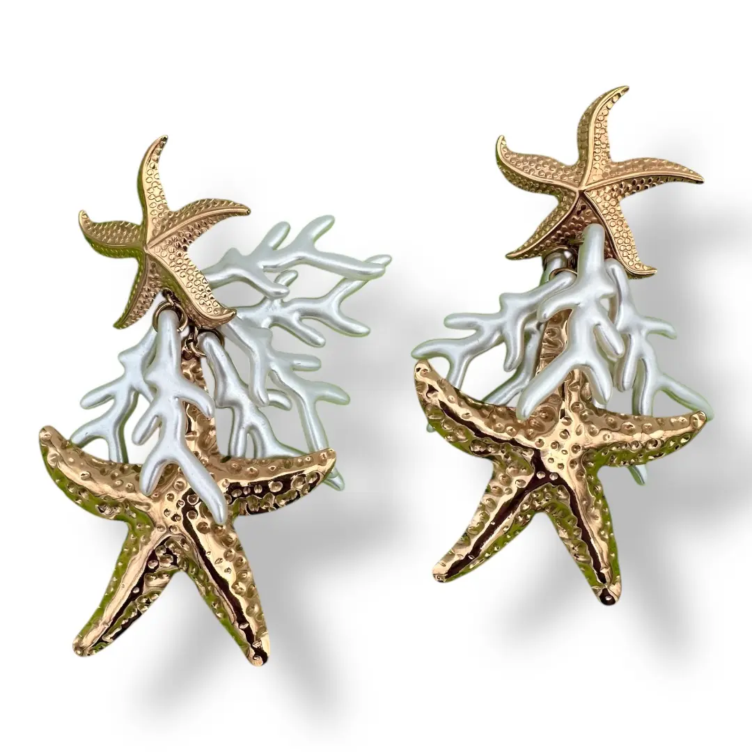 Bring the essence of summer with you with this stunning coral necklace, embellished with delicate golden stars that illuminate the décolleté with a refined and marine touch. A perfect jewel for those who love to stand out with style, ideal to wear alone or paired with the matching earrings for a complete and sophisticated look.